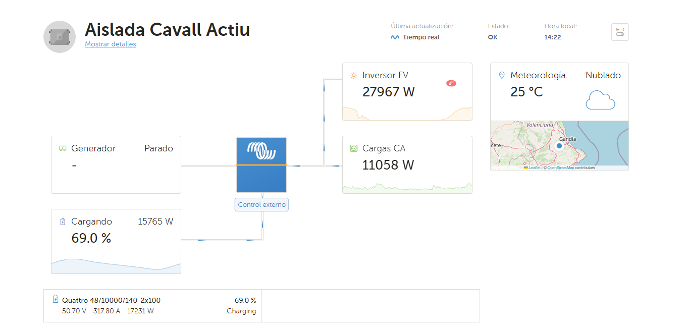 En este caso, al tratarse de un sistema aislado de la red con grupos electrógenos como fuente secundaria, implica que el 15,7% de la energía han sido suministrados por los generadores Diesel. La cobertura solar es elevadísima y es difícil de aumentar. Por cuestiones climatológicas no es posible llegar al 100%, por lo que para incrementar dicho porcentaje hay que sobre dimensionar en exceso la generación y el almacenamiento solar. Sobre dimensionar implica reducir el aprovechamiento del sistema y obliga a aumentar la inversión. Como consecuencia disminuye la rentabilidad del sistema.